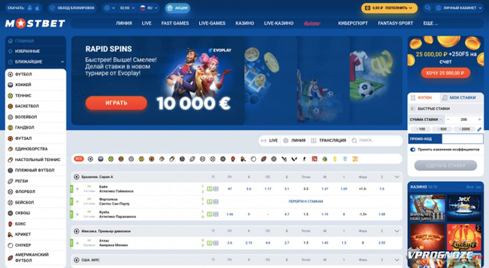 На платформе доступны более 20 видов спорта, включая футбол, хоккей, баскетбол, теннис, бокс, волейбол и киберспорт. Для каждой дисциплины предлагаются сотни вариантов исходов и коэффициенты, формируемые в реальном времени. В разделе Live можно отслеживать динамику событий и коэффициентов, а также использовать статистику и результаты прошлых матчей.